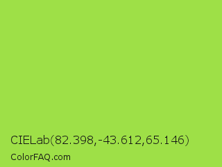 CIELab 82.398,-43.612,65.146 Color is a normal green color and the nearest color is Conifer #acdd4d. Hex code #9ee047 and RGB value is rgb(158,224,71). In RGB color space, this color is composed of 62% red, 88% green, 28% blue, In CMYK color space, this color is composed of 29% cyan, 0% magenta, 68% yellow , 12% black , In HSL color space, this color has a hue angle of 86° , 71% saturation and 58% lightness.