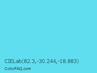 CIELab 82.3,-30.244,-18.883 Color is a light cyan color and the nearest color is Turquoise Blue #6cdae7. Hex code #5edeef and RGB value is rgb(94,222,239). In RGB color space, this color is composed of 37% red, 87% green, 94% blue, In CMYK color space, this color is composed of 61% cyan, 7% magenta, 0% yellow , 6% black , In HSL color space, this color has a hue angle of 187° , 82% saturation and 65% lightness.