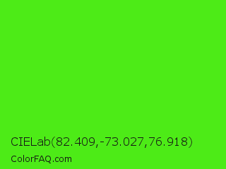 CIELab 82.409,-73.027,76.918 Color is a normal green color and the nearest color is Neon Green #39ff14. Hex code #4deb17 and RGB value is rgb(77,235,23). In RGB color space, this color is composed of 30% red, 92% green, 9% blue, In CMYK color space, this color is composed of 67% cyan, 0% magenta, 90% yellow , 8% black , In HSL color space, this color has a hue angle of 105° , 84% saturation and 51% lightness.