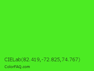 CIELab 82.419,-72.825,74.767 Color is a normal green color and the nearest color is Neon Green #39ff14. Hex code #4ceb23 and RGB value is rgb(76,235,35). In RGB color space, this color is composed of 30% red, 92% green, 14% blue, In CMYK color space, this color is composed of 68% cyan, 0% magenta, 85% yellow , 8% black , In HSL color space, this color has a hue angle of 108° , 83% saturation and 53% lightness.