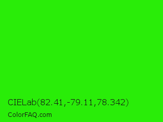 CIELab 82.41,-79.11,78.342 Color is a normal green color and the nearest color is Neon Green #39ff14. Hex code #29ed08 and RGB value is rgb(41,237,8). In RGB color space, this color is composed of 16% red, 93% green, 3% blue, In CMYK color space, this color is composed of 83% cyan, 0% magenta, 97% yellow , 7% black , In HSL color space, this color has a hue angle of 111° , 93% saturation and 48% lightness.