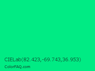 CIELab 82.423,-69.743,36.953 Color is a normal green color and the nearest color is Spring Green #00ff7f. Hex code #00eb84 and RGB value is rgb(0,235,132). In RGB color space, this color is composed of 0% red, 92% green, 52% blue, In CMYK color space, this color is composed of 100% cyan, 0% magenta, 44% yellow , 8% black , In HSL color space, this color has a hue angle of 154° , 100% saturation and 46% lightness.