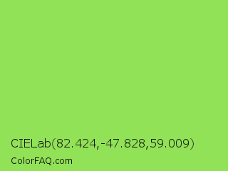 CIELab 82.424,-47.828,59.009 Color is a light green color and the nearest color is Kiwi #8ee53f. Hex code #91e256 and RGB value is rgb(145,226,86). In RGB color space, this color is composed of 57% red, 89% green, 34% blue, In CMYK color space, this color is composed of 36% cyan, 0% magenta, 62% yellow , 11% black , In HSL color space, this color has a hue angle of 95° , 71% saturation and 61% lightness.