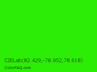 CIELab 82.429,-78.952,78.618 Color is a normal green color and the nearest color is Neon Green #39ff14. Hex code #2bed05 and RGB value is rgb(43,237,5). In RGB color space, this color is composed of 17% red, 93% green, 2% blue, In CMYK color space, this color is composed of 82% cyan, 0% magenta, 98% yellow , 7% black , In HSL color space, this color has a hue angle of 110° , 96% saturation and 47% lightness.