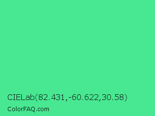 CIELab 82.431,-60.622,30.58 Color is a normal green color and the nearest color is Eucalyptus #44d7a8. Hex code #47e891 and RGB value is rgb(71,232,145). In RGB color space, this color is composed of 28% red, 91% green, 57% blue, In CMYK color space, this color is composed of 69% cyan, 0% magenta, 38% yellow , 9% black , In HSL color space, this color has a hue angle of 148° , 78% saturation and 59% lightness.