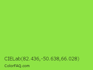 CIELab 82.436,-50.638,66.028 Color is a normal green color and the nearest color is Kiwi #8ee53f. Hex code #8ee344 and RGB value is rgb(142,227,68). In RGB color space, this color is composed of 56% red, 89% green, 27% blue, In CMYK color space, this color is composed of 37% cyan, 0% magenta, 70% yellow , 11% black , In HSL color space, this color has a hue angle of 92° , 74% saturation and 58% lightness.