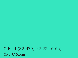 CIELab 82.439,-52.225,6.65 Color is a normal cyan color and the nearest color is Turquoise PWG #30d5c8. Hex code #35e6bf and RGB value is rgb(53,230,191). In RGB color space, this color is composed of 21% red, 90% green, 75% blue, In CMYK color space, this color is composed of 77% cyan, 0% magenta, 17% yellow , 10% black , In HSL color space, this color has a hue angle of 167° , 78% saturation and 55% lightness.