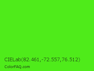 CIELab 82.461,-72.557,76.512 Color is a normal green color and the nearest color is Neon Green #39ff14. Hex code #4feb1a and RGB value is rgb(79,235,26). In RGB color space, this color is composed of 31% red, 92% green, 10% blue, In CMYK color space, this color is composed of 66% cyan, 0% magenta, 89% yellow , 8% black , In HSL color space, this color has a hue angle of 105° , 84% saturation and 51% lightness.