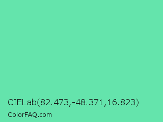 CIELab 82.473,-48.371,16.823 Color is a light green color and the nearest color is Medium Aquamarine #66ddaa. Hex code #64e4ac and RGB value is rgb(100,228,172). In RGB color space, this color is composed of 39% red, 89% green, 67% blue, In CMYK color space, this color is composed of 56% cyan, 0% magenta, 25% yellow , 11% black , In HSL color space, this color has a hue angle of 154° , 70% saturation and 64% lightness.