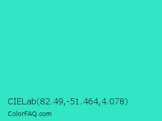 CIELab 82.49,-51.464,4.078 Color is a normal cyan color and the nearest color is Turquoise PWG #30d5c8. Hex code #30e6c4 and RGB value is rgb(48,230,196). In RGB color space, this color is composed of 19% red, 90% green, 77% blue, In CMYK color space, this color is composed of 79% cyan, 0% magenta, 15% yellow , 10% black , In HSL color space, this color has a hue angle of 169° , 78% saturation and 55% lightness.