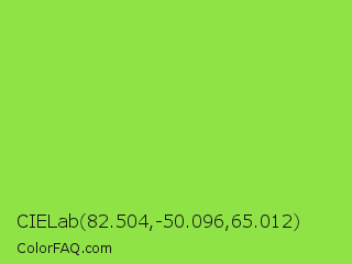 CIELab 82.504,-50.096,65.012 Color is a normal green color and the nearest color is Kiwi #8ee53f. Hex code #8fe347 and RGB value is rgb(143,227,71). In RGB color space, this color is composed of 56% red, 89% green, 28% blue, In CMYK color space, this color is composed of 37% cyan, 0% magenta, 69% yellow , 11% black , In HSL color space, this color has a hue angle of 92° , 74% saturation and 58% lightness.