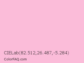 CIELab 82.512,26.487,-5.284 Color is a very light rose color and the nearest color is Cupid #fbbeda. Hex code #fabcd8 and RGB value is rgb(250,188,216). In RGB color space, this color is composed of 98% red, 74% green, 85% blue, In CMYK color space, this color is composed of 0% cyan, 25% magenta, 14% yellow , 2% black , In HSL color space, this color has a hue angle of 333° , 86% saturation and 86% lightness.