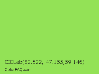 CIELab 82.522,-47.155,59.146 Color is a light green color and the nearest color is Kiwi #8ee53f. Hex code #93e256 and RGB value is rgb(147,226,86). In RGB color space, this color is composed of 58% red, 89% green, 34% blue, In CMYK color space, this color is composed of 35% cyan, 0% magenta, 62% yellow , 11% black , In HSL color space, this color has a hue angle of 94° , 71% saturation and 61% lightness.