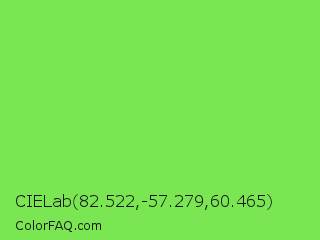 CIELab 82.522,-57.279,60.465 Color is a light green color and the nearest color is Kiwi #8ee53f. Hex code #79e652 and RGB value is rgb(121,230,82). In RGB color space, this color is composed of 47% red, 90% green, 32% blue, In CMYK color space, this color is composed of 47% cyan, 0% magenta, 64% yellow , 10% black , In HSL color space, this color has a hue angle of 104° , 75% saturation and 61% lightness.