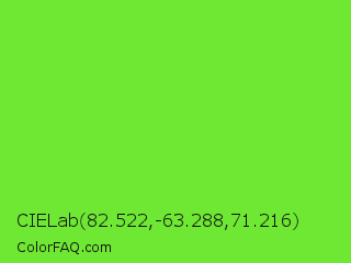CIELab 82.522,-63.288,71.216 Color is a normal green color and the nearest color is Kiwi #8ee53f. Hex code #6ee833 and RGB value is rgb(110,232,51). In RGB color space, this color is composed of 43% red, 91% green, 20% blue, In CMYK color space, this color is composed of 53% cyan, 0% magenta, 78% yellow , 9% black , In HSL color space, this color has a hue angle of 100° , 80% saturation and 55% lightness.
