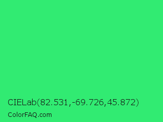 CIELab 82.531,-69.726,45.872 Color is a normal green color and the nearest color is UFO Green #3cd070. Hex code #31eb72 and RGB value is rgb(49,235,114). In RGB color space, this color is composed of 19% red, 92% green, 45% blue, In CMYK color space, this color is composed of 79% cyan, 0% magenta, 51% yellow , 8% black , In HSL color space, this color has a hue angle of 141° , 82% saturation and 56% lightness.