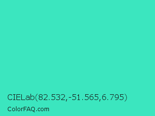 CIELab 82.532,-51.565,6.795 Color is a normal cyan color and the nearest color is Turquoise #40e0d0. Hex code #3be6bf and RGB value is rgb(59,230,191). In RGB color space, this color is composed of 23% red, 90% green, 75% blue, In CMYK color space, this color is composed of 74% cyan, 0% magenta, 17% yellow , 10% black , In HSL color space, this color has a hue angle of 166° , 77% saturation and 57% lightness.