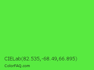 CIELab 82.535,-68.49,66.895 Color is a normal green color and the nearest color is Screamin Green #66ff66. Hex code #58ea40 and RGB value is rgb(88,234,64). In RGB color space, this color is composed of 35% red, 92% green, 25% blue, In CMYK color space, this color is composed of 62% cyan, 0% magenta, 73% yellow , 8% black , In HSL color space, this color has a hue angle of 112° , 80% saturation and 58% lightness.