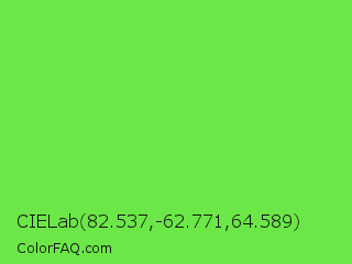 CIELab 82.537,-62.771,64.589 Color is a normal green color and the nearest color is Kiwi #8ee53f. Hex code #6be847 and RGB value is rgb(107,232,71). In RGB color space, this color is composed of 42% red, 91% green, 28% blue, In CMYK color space, this color is composed of 54% cyan, 0% magenta, 69% yellow , 9% black , In HSL color space, this color has a hue angle of 107° , 78% saturation and 59% lightness.
