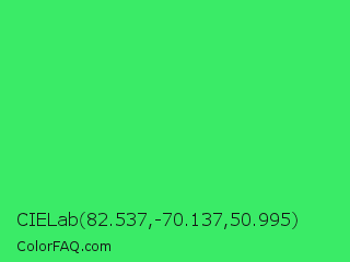 CIELab 82.537,-70.137,50.995 Color is a normal green color and the nearest color is UFO Green #3cd070. Hex code #3aeb67 and RGB value is rgb(58,235,103). In RGB color space, this color is composed of 23% red, 92% green, 40% blue, In CMYK color space, this color is composed of 75% cyan, 0% magenta, 56% yellow , 8% black , In HSL color space, this color has a hue angle of 135° , 82% saturation and 57% lightness.