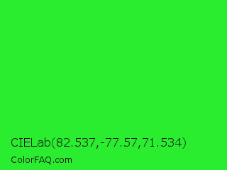 CIELab 82.537,-77.57,71.534 Color is a normal green color and the nearest color is Lime Green #32cd32. Hex code #2bed30 and RGB value is rgb(43,237,48). In RGB color space, this color is composed of 17% red, 93% green, 19% blue, In CMYK color space, this color is composed of 82% cyan, 0% magenta, 80% yellow , 7% black , In HSL color space, this color has a hue angle of 122° , 84% saturation and 55% lightness.