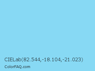 CIELab 82.544,-18.104,-21.023 Color is a light blue color and the nearest color is Pale Cyan #87d3f8. Hex code #87d9f4 and RGB value is rgb(135,217,244). In RGB color space, this color is composed of 53% red, 85% green, 96% blue, In CMYK color space, this color is composed of 45% cyan, 11% magenta, 0% yellow , 4% black , In HSL color space, this color has a hue angle of 195° , 83% saturation and 74% lightness.