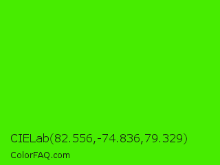 CIELab 82.556,-74.836,79.329 Color is a normal green color and the nearest color is Chlorophyll Green #4aff00. Hex code #47ec00 and RGB value is rgb(71,236,0). In RGB color space, this color is composed of 28% red, 93% green, 0% blue, In CMYK color space, this color is composed of 70% cyan, 0% magenta, 100% yellow , 7% black , In HSL color space, this color has a hue angle of 102° , 100% saturation and 46% lightness.