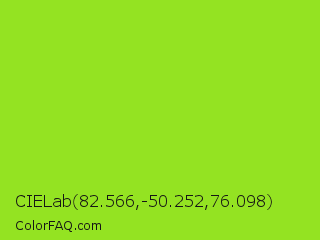 CIELab 82.566,-50.252,76.098 Color is a normal green color and the nearest color is Atlantis #97cd2d. Hex code #94e322 and RGB value is rgb(148,227,34). In RGB color space, this color is composed of 58% red, 89% green, 13% blue, In CMYK color space, this color is composed of 35% cyan, 0% magenta, 85% yellow , 11% black , In HSL color space, this color has a hue angle of 85° , 78% saturation and 51% lightness.