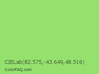 CIELab 82.575,-43.649,48.516 Color is a light green color and the nearest color is Pistachio #93c572. Hex code #95e16e and RGB value is rgb(149,225,110). In RGB color space, this color is composed of 58% red, 88% green, 43% blue, In CMYK color space, this color is composed of 34% cyan, 0% magenta, 51% yellow , 12% black , In HSL color space, this color has a hue angle of 100° , 66% saturation and 66% lightness.