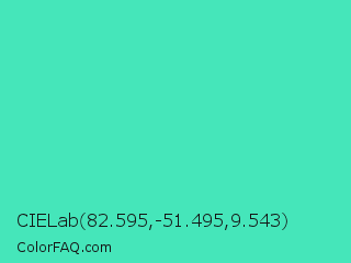 CIELab 82.595,-51.495,9.543 Color is a normal cyan color and the nearest color is Turquoise #40e0d0. Hex code #45e6ba and RGB value is rgb(69,230,186). In RGB color space, this color is composed of 27% red, 90% green, 73% blue, In CMYK color space, this color is composed of 70% cyan, 0% magenta, 19% yellow , 10% black , In HSL color space, this color has a hue angle of 164° , 76% saturation and 59% lightness.