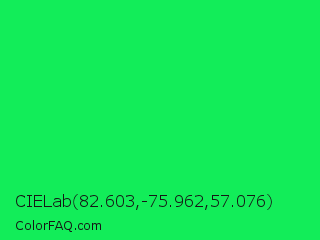 CIELab 82.603,-75.962,57.076 Color is a normal green color and the nearest color is Malachite #0bda51. Hex code #12ed59 and RGB value is rgb(18,237,89). In RGB color space, this color is composed of 7% red, 93% green, 35% blue, In CMYK color space, this color is composed of 92% cyan, 0% magenta, 62% yellow , 7% black , In HSL color space, this color has a hue angle of 139° , 86% saturation and 50% lightness.