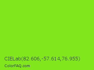 CIELab 82.606,-57.614,76.955 Color is a normal green color and the nearest color is Alien Armpit #84de02. Hex code #82e61c and RGB value is rgb(130,230,28). In RGB color space, this color is composed of 51% red, 90% green, 11% blue, In CMYK color space, this color is composed of 43% cyan, 0% magenta, 88% yellow , 10% black , In HSL color space, this color has a hue angle of 90° , 80% saturation and 51% lightness.