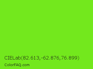 CIELab 82.613,-62.876,76.899 Color is a normal green color and the nearest color is Alien Armpit #84de02. Hex code #73e81b and RGB value is rgb(115,232,27). In RGB color space, this color is composed of 45% red, 91% green, 11% blue, In CMYK color space, this color is composed of 50% cyan, 0% magenta, 88% yellow , 9% black , In HSL color space, this color has a hue angle of 94° , 82% saturation and 51% lightness.
