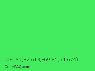 CIELab 82.613,-69.81,54.674 Color is a normal green color and the nearest color is UFO Green #3cd070. Hex code #43eb5f and RGB value is rgb(67,235,95). In RGB color space, this color is composed of 26% red, 92% green, 37% blue, In CMYK color space, this color is composed of 71% cyan, 0% magenta, 60% yellow , 8% black , In HSL color space, this color has a hue angle of 130° , 81% saturation and 59% lightness.