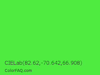 CIELab 82.62,-70.642,66.908 Color is a normal green color and the nearest color is Lime Green #32cd32. Hex code #4feb40 and RGB value is rgb(79,235,64). In RGB color space, this color is composed of 31% red, 92% green, 25% blue, In CMYK color space, this color is composed of 66% cyan, 0% magenta, 73% yellow , 8% black , In HSL color space, this color has a hue angle of 115° , 81% saturation and 59% lightness.