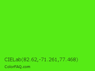 CIELab 82.62,-71.261,77.468 Color is a normal green color and the nearest color is Chlorophyll Green #4aff00. Hex code #56eb15 and RGB value is rgb(86,235,21). In RGB color space, this color is composed of 34% red, 92% green, 8% blue, In CMYK color space, this color is composed of 63% cyan, 0% magenta, 91% yellow , 8% black , In HSL color space, this color has a hue angle of 102° , 84% saturation and 50% lightness.