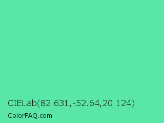 CIELab 82.631,-52.64,20.124 Color is a light green color and the nearest color is Medium Aquamarine #66ddaa. Hex code #59e6a6 and RGB value is rgb(89,230,166). In RGB color space, this color is composed of 35% red, 90% green, 65% blue, In CMYK color space, this color is composed of 61% cyan, 0% magenta, 28% yellow , 10% black , In HSL color space, this color has a hue angle of 153° , 74% saturation and 63% lightness.