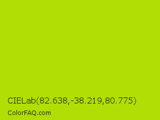 CIELab 82.638,-38.219,80.775 Color is a normal lime color and the nearest color is Vivid Lime Green #a6d608. Hex code #b0de05 and RGB value is rgb(176,222,5). In RGB color space, this color is composed of 69% red, 87% green, 2% blue, In CMYK color space, this color is composed of 21% cyan, 0% magenta, 98% yellow , 13% black , In HSL color space, this color has a hue angle of 73° , 96% saturation and 45% lightness.