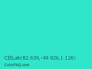 CIELab 82.639,-49.926,1.126 Color is a normal cyan color and the nearest color is Turquoise PWG #30d5c8. Hex code #30e6ca and RGB value is rgb(48,230,202). In RGB color space, this color is composed of 19% red, 90% green, 79% blue, In CMYK color space, this color is composed of 79% cyan, 0% magenta, 12% yellow , 10% black , In HSL color space, this color has a hue angle of 171° , 78% saturation and 55% lightness.