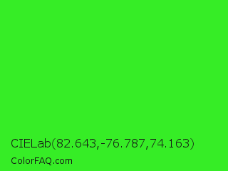 CIELab 82.643,-76.787,74.163 Color is a normal green color and the nearest color is Neon Green #39ff14. Hex code #36ed26 and RGB value is rgb(54,237,38). In RGB color space, this color is composed of 21% red, 93% green, 15% blue, In CMYK color space, this color is composed of 77% cyan, 0% magenta, 84% yellow , 7% black , In HSL color space, this color has a hue angle of 115° , 85% saturation and 54% lightness.