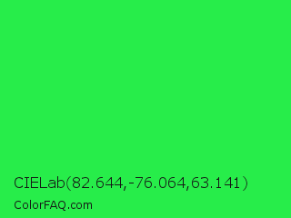 CIELab 82.644,-76.064,63.141 Color is a normal green color and the nearest color is Malachite #0bda51. Hex code #27ed4a and RGB value is rgb(39,237,74). In RGB color space, this color is composed of 15% red, 93% green, 29% blue, In CMYK color space, this color is composed of 84% cyan, 0% magenta, 69% yellow , 7% black , In HSL color space, this color has a hue angle of 131° , 85% saturation and 54% lightness.