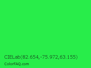CIELab 82.654,-75.972,63.155 Color is a normal green color and the nearest color is Malachite #0bda51. Hex code #28ed4a and RGB value is rgb(40,237,74). In RGB color space, this color is composed of 16% red, 93% green, 29% blue, In CMYK color space, this color is composed of 83% cyan, 0% magenta, 69% yellow , 7% black , In HSL color space, this color has a hue angle of 130° , 85% saturation and 54% lightness.