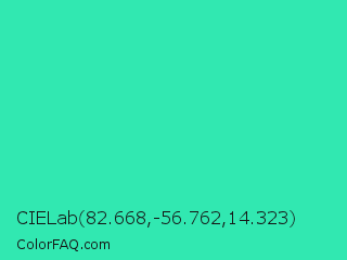 CIELab 82.668,-56.762,14.323 Color is a normal green color and the nearest color is Eucalyptus #44d7a8. Hex code #31e8b1 and RGB value is rgb(49,232,177). In RGB color space, this color is composed of 19% red, 91% green, 69% blue, In CMYK color space, this color is composed of 79% cyan, 0% magenta, 24% yellow , 9% black , In HSL color space, this color has a hue angle of 162° , 80% saturation and 55% lightness.