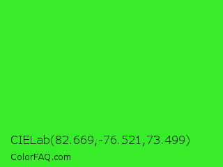 CIELab 82.669,-76.521,73.499 Color is a normal green color and the nearest color is Neon Green #39ff14. Hex code #37ed29 and RGB value is rgb(55,237,41). In RGB color space, this color is composed of 22% red, 93% green, 16% blue, In CMYK color space, this color is composed of 77% cyan, 0% magenta, 83% yellow , 7% black , In HSL color space, this color has a hue angle of 116° , 84% saturation and 55% lightness.