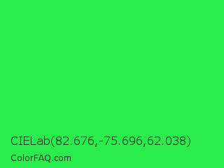 CIELab 82.676,-75.696,62.038 Color is a normal green color and the nearest color is Malachite #0bda51. Hex code #28ed4d and RGB value is rgb(40,237,77). In RGB color space, this color is composed of 16% red, 93% green, 30% blue, In CMYK color space, this color is composed of 83% cyan, 0% magenta, 68% yellow , 7% black , In HSL color space, this color has a hue angle of 131° , 85% saturation and 54% lightness.