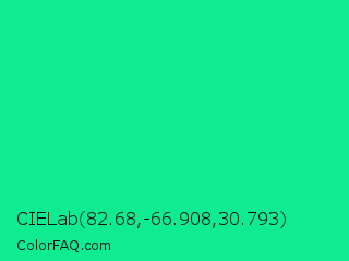 CIELab 82.68,-66.908,30.793 Color is a normal green color and the nearest color is Medium Spring Green #00fa9a. Hex code #0feb91 and RGB value is rgb(15,235,145). In RGB color space, this color is composed of 6% red, 92% green, 57% blue, In CMYK color space, this color is composed of 94% cyan, 0% magenta, 38% yellow , 8% black , In HSL color space, this color has a hue angle of 155° , 88% saturation and 49% lightness.