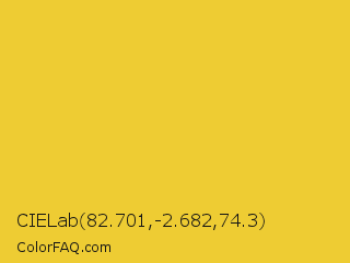 CIELab 82.701,-2.682,74.3 Color is a normal yellow color and the nearest color is Saffron #f4c430. Hex code #eecc33 and RGB value is rgb(238,204,51). In RGB color space, this color is composed of 93% red, 80% green, 20% blue, In CMYK color space, this color is composed of 0% cyan, 14% magenta, 79% yellow , 7% black , In HSL color space, this color has a hue angle of 49° , 85% saturation and 57% lightness.