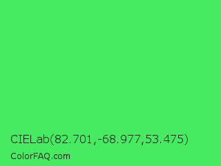 CIELab 82.701,-68.977,53.475 Color is a normal green color and the nearest color is UFO Green #3cd070. Hex code #46eb62 and RGB value is rgb(70,235,98). In RGB color space, this color is composed of 27% red, 92% green, 38% blue, In CMYK color space, this color is composed of 70% cyan, 0% magenta, 58% yellow , 8% black , In HSL color space, this color has a hue angle of 130° , 80% saturation and 60% lightness.
