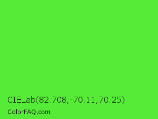 CIELab 82.708,-70.11,70.25 Color is a normal green color and the nearest color is Lime Green #32cd32. Hex code #55eb36 and RGB value is rgb(85,235,54). In RGB color space, this color is composed of 33% red, 92% green, 21% blue, In CMYK color space, this color is composed of 64% cyan, 0% magenta, 77% yellow , 8% black , In HSL color space, this color has a hue angle of 110° , 82% saturation and 57% lightness.