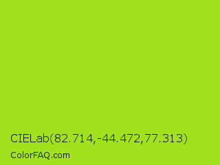 CIELab 82.714,-44.472,77.313 Color is a normal lime color and the nearest color is Inch Worm #b0e313. Hex code #a2e11e and RGB value is rgb(162,225,30). In RGB color space, this color is composed of 64% red, 88% green, 12% blue, In CMYK color space, this color is composed of 28% cyan, 0% magenta, 87% yellow , 12% black , In HSL color space, this color has a hue angle of 79° , 76% saturation and 50% lightness.